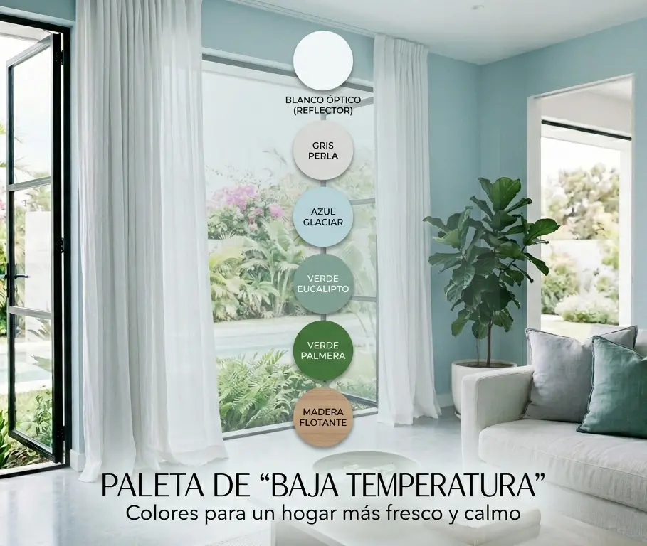- Subtonos Minerales: Olvida los beiges cálidos. Apuesta por el Gris Perla, el Azul Glaciar o el Verde Eucalipto. Estos tonos tienen una longitud de onda que nuestro cerebro procesa como "fría", bajando el pulso y la sensación de sofoco.
