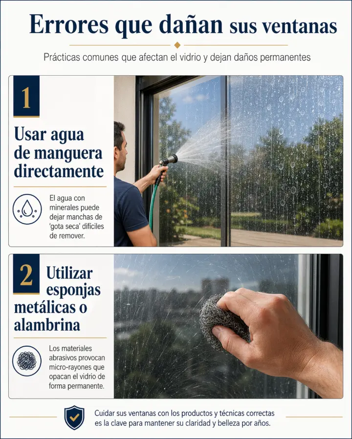 Uno de los errores más comunes es limpiar el vidrio con cualquier trapo sin verificar antes si hay polvo, residuos de concreto o materiales abrasivos sobre la superficie. Esto puede provocar rayaduras permanentes que no tienen reparación.