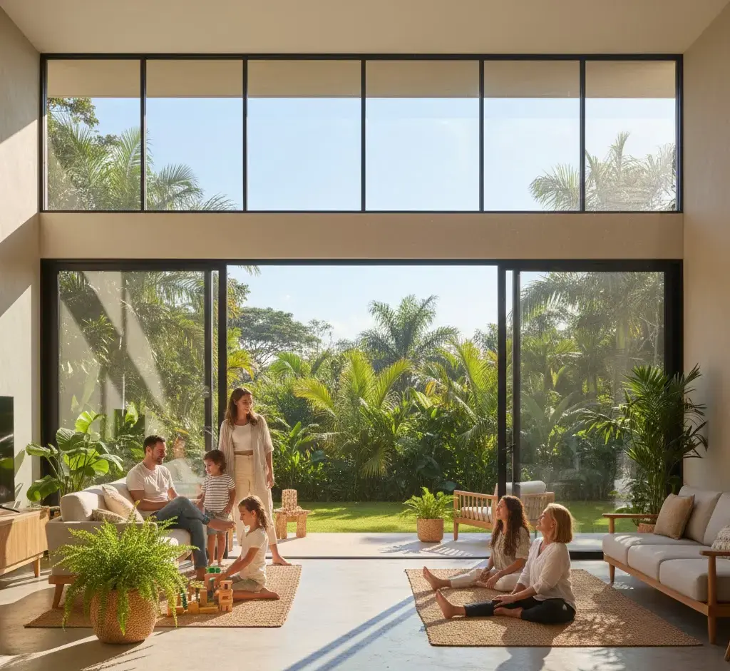 👉 Para que esto funcione en climas tropicales, el sistema de aluminio y el tipo de vidrio son determinantes. No todos los sistemas están preparados para grandes dimensiones, viento y lluvia intensa.